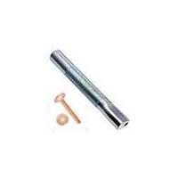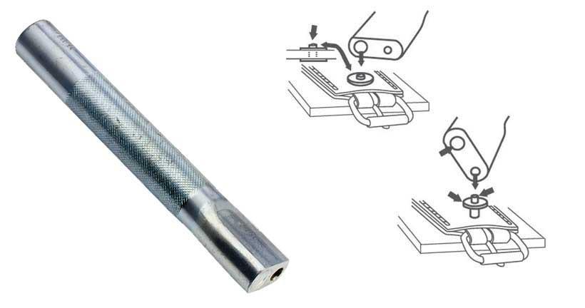リベットにワッシャーを嵌め込んで固定し、バーの余分な足をカットすることで、かしめるこのとできる金具です。