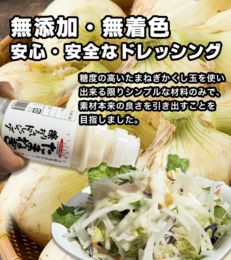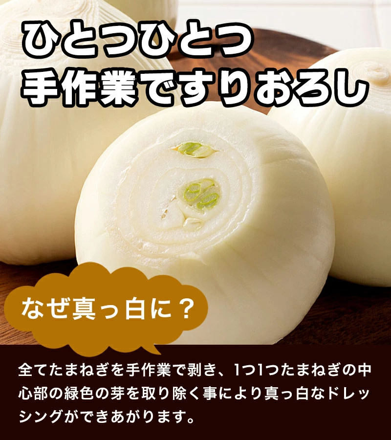 たまねぎ本来のおいしさを引き出し、1本1本手作業でたまねぎを擦りおろした真っ白なこだわりのドレッシングです。