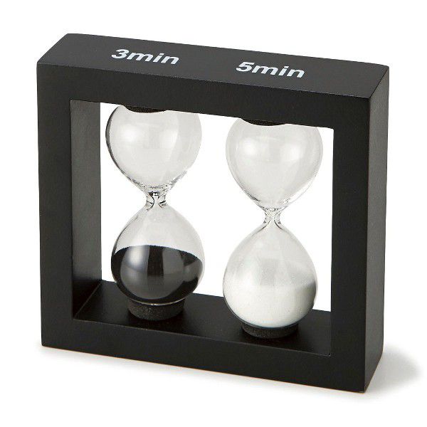 3分計と5分計のガラス砂時計が黒い木枠におさまったシンプルな砂時計です。