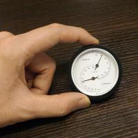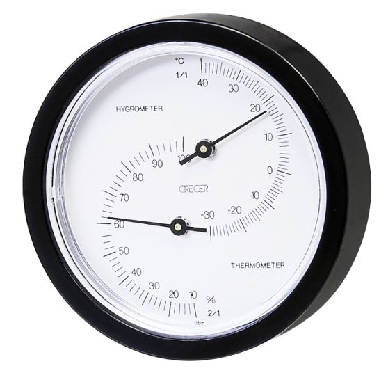 温度計は-30℃から40℃、湿度計は10%〜100%の範囲を測定。温度計は一目盛り1℃、湿度計は2%です。