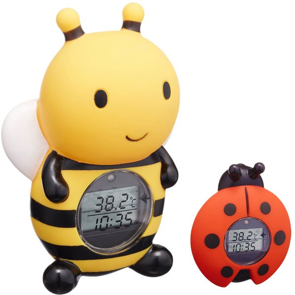 ミツバチのかわいいデザインの湯温計は湯船に浮かべてお湯の温度を表示する防水構造の温度計です。