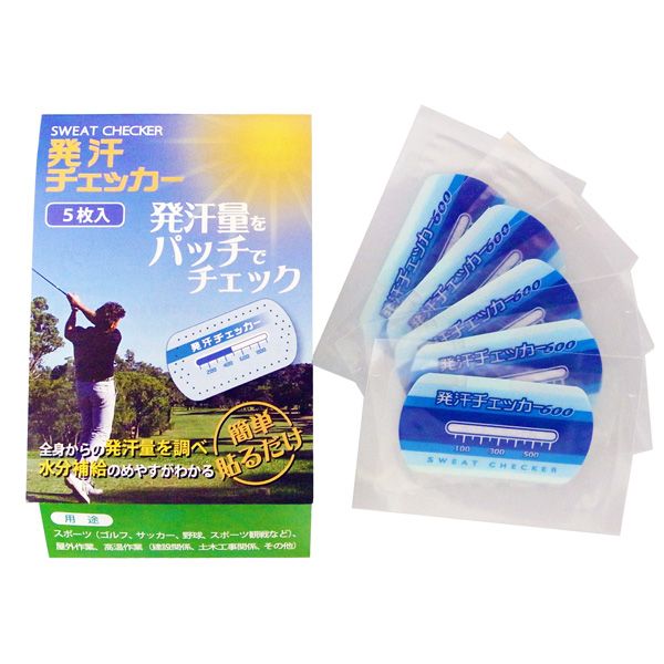 発汗チェッカーは腕に貼付することで全身からの発汗量を調べることができます。発汗チェッカーを貼ってスポーツや高温作業を行うと、貼付時間中の発汗量を数10〜100g単位で確認できるので、給水のタイミングや給水量の参考とすることができます。5枚入です。