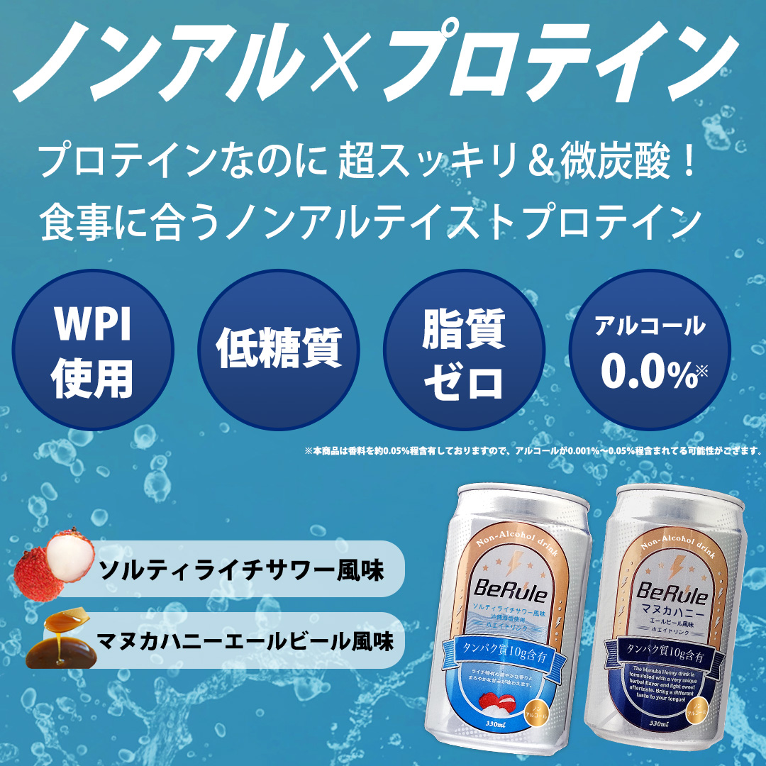 とはいえ、水やお茶ばかりではちょっとあじけない。 もっとトレーニング後の食事が楽しみになり、しかも、筋肉が喜ぶ飲み物はないだろうか? そんな思いから今開発したのが、ノンアルコールのビールテイストプロテイン飲料「BeRule」です。