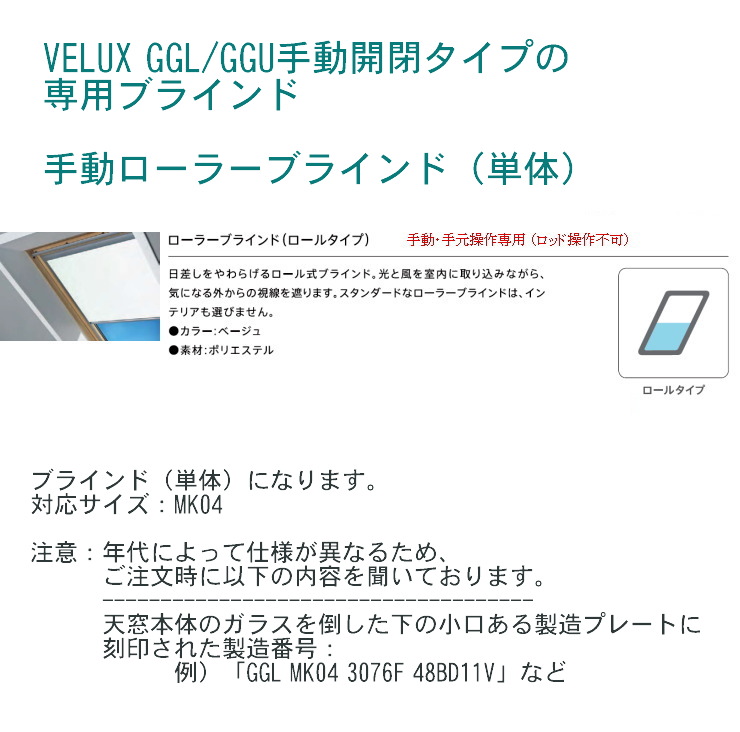メーカー製品情報ページ:(そのページのブラインドを参照) VELUX GGL/GGU手動タイプ