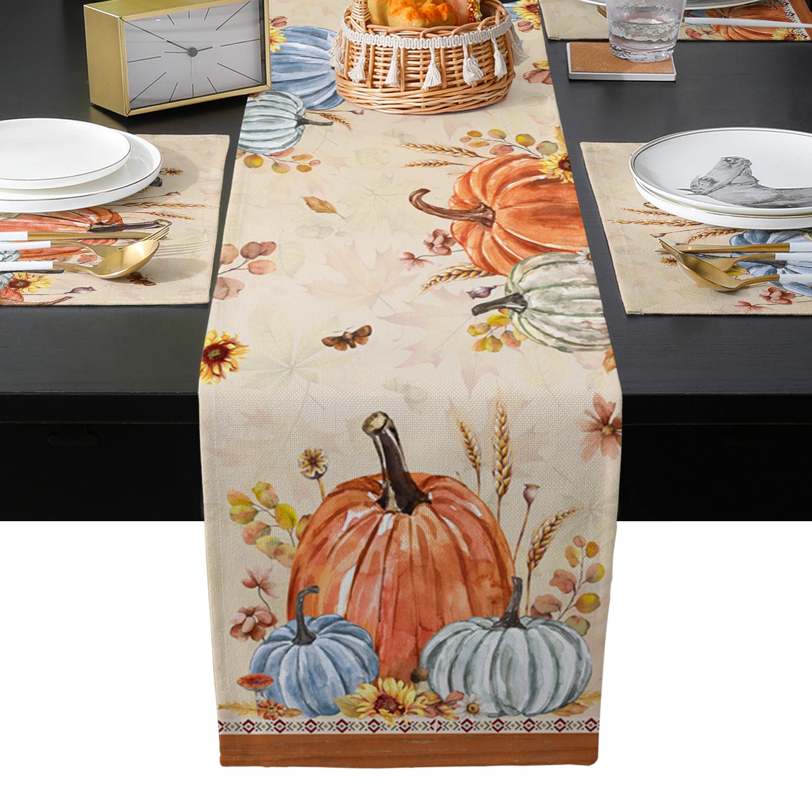 【並行輸入品】秋の葉 パンプキン 90インチ テーブルランナー プレースマットセット 感謝祭 ファームハウス 洗濯可能 滑り止め コットンリネン
