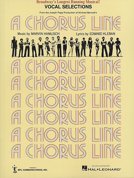目立たないその他大勢組のダンサーたちの人生からショービジネスの舞台裏を描いたミュージカル、『コーラスライン A CHORUS LINE』のボーカル、ピアノ、コード譜です。