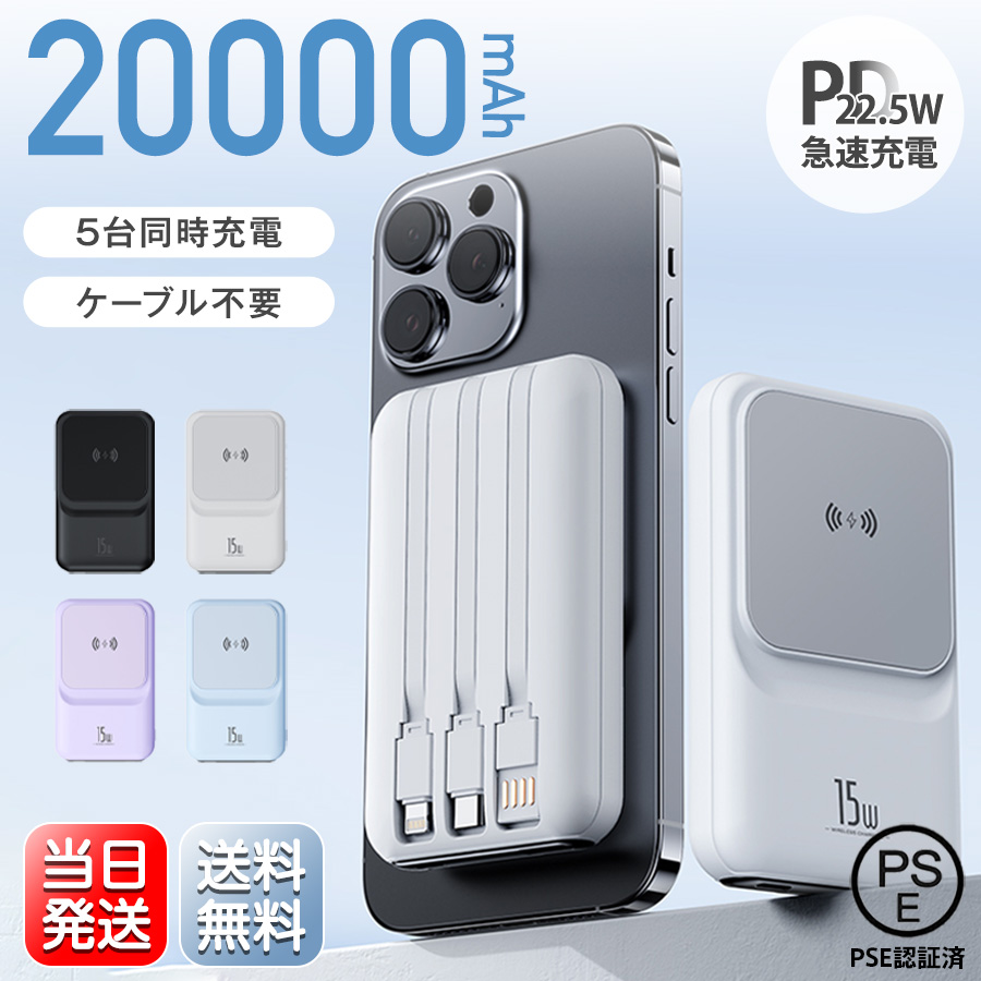 【新春限定20%OFF】 モバイルバッテリー 大容量 20000mAh 軽量 iPhone 16 magsafe ワイヤレス充電 小型 5台同時充電 ケーブル不要 急速 薄型 PD 災害用