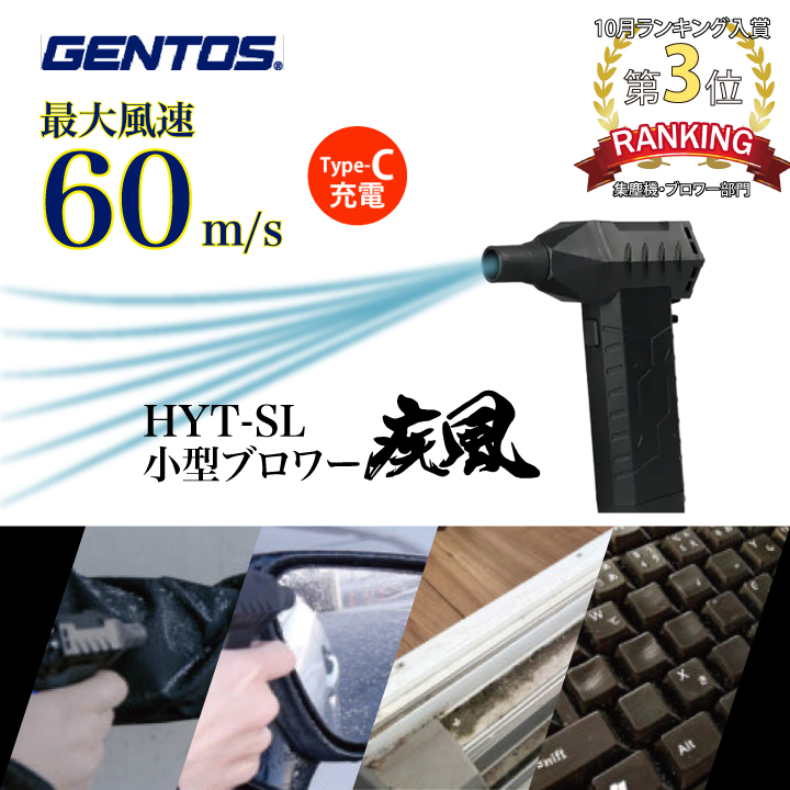 即納 ブロワー 充電式 疾風 小型 コンパクト 電動送風機 エアダスター 空気入れ PC掃除 キーボード 洗車 車内 掃除 キャンプ GENTOS ジェントス HYT-SL 爆買