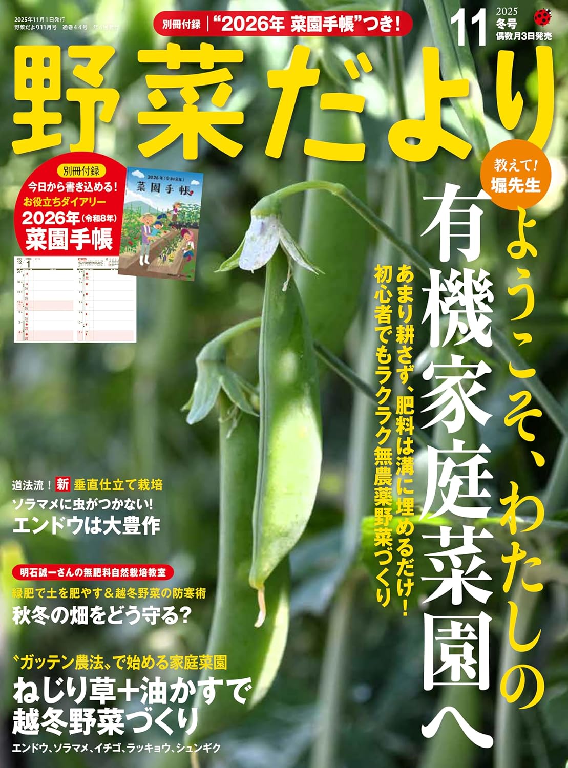 他、三浦伸章さんの「ガッテン農法」で始める家庭菜園、道法正徳さんの「垂直仕立て栽培」など人気の連載をはじめ、冬に向けて家庭菜園で知りたい情報が満載。