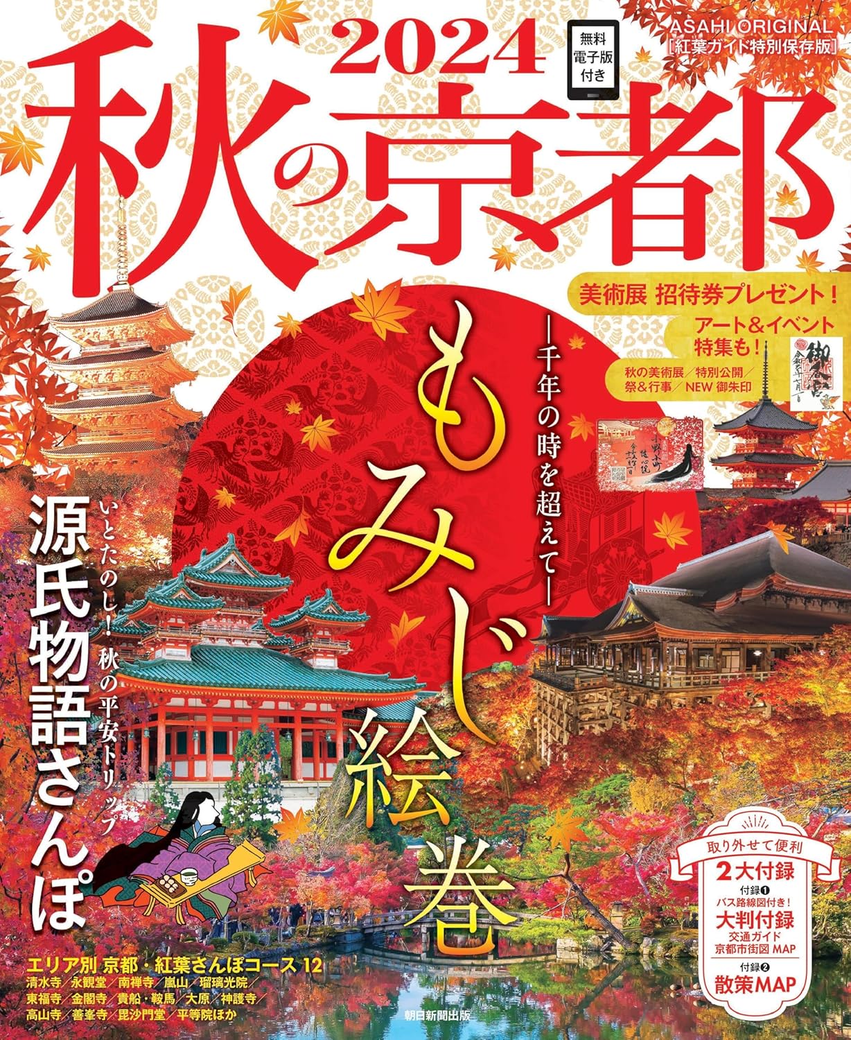 ・2024年大河ドラマで話題!源氏物語×秋の京都さんぽ特集に注目・巻頭グラビアでは、京都の紅葉名所を時代ごとに徹底ナビ・ゴージャスな世界遺産の紅葉ライトアップ記事は必見・今年注目の美術展や特別公開、イベント情報も充実・紅葉ビューの京グルメや秋限定スイーツも外せない・エリア別紅葉ガイドで迷わず散策できる・取り外せる散策マップに、今年は京都市街図の大判付録も追加