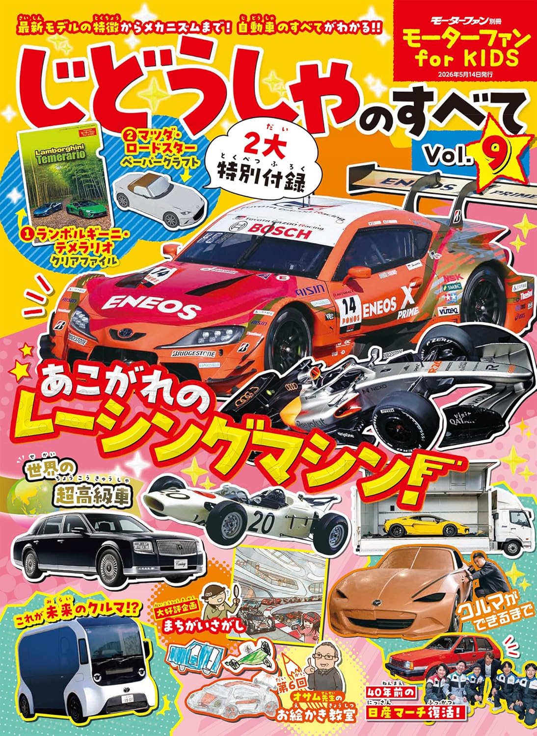 「じどうしゃのすべて Vol.9」は「ランボルギーニ・テメラリオ・クリアファイル」と「マツダ・ロードスター・ペーパークラフト」の2大特別付録つき!