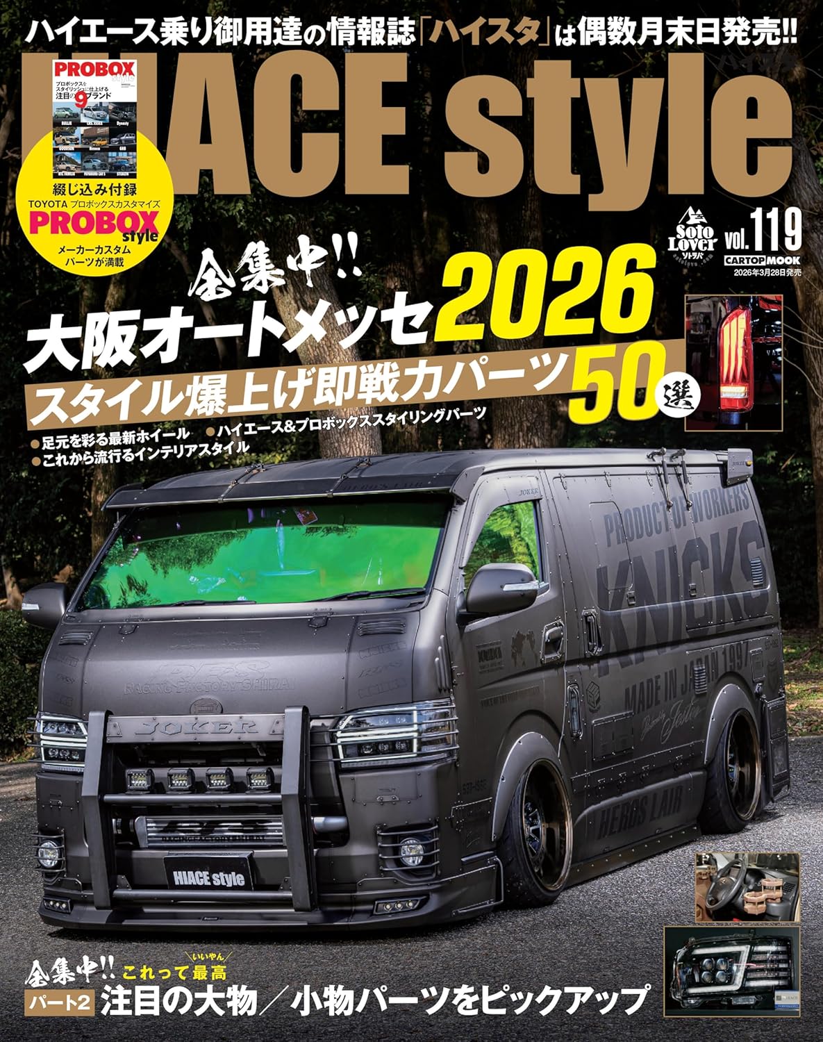 さらに、大阪オートメッセ2026にて「PROBOX style」ブースに展示されていた魅惑のカスタマイズ・プロボックスももれなく掲載するとともに、新作情報も発信しています。