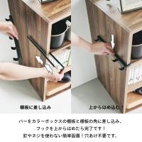 ※設置の際は、カラーボックス内の収納物と接触しないようご注意ください。 カラーボックス内の収納物を取り出す際に、製品に引っ掛かり、製品や収納物が落下しケガや破損の原因となりますので ご注意ください。