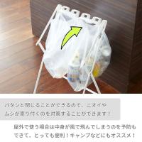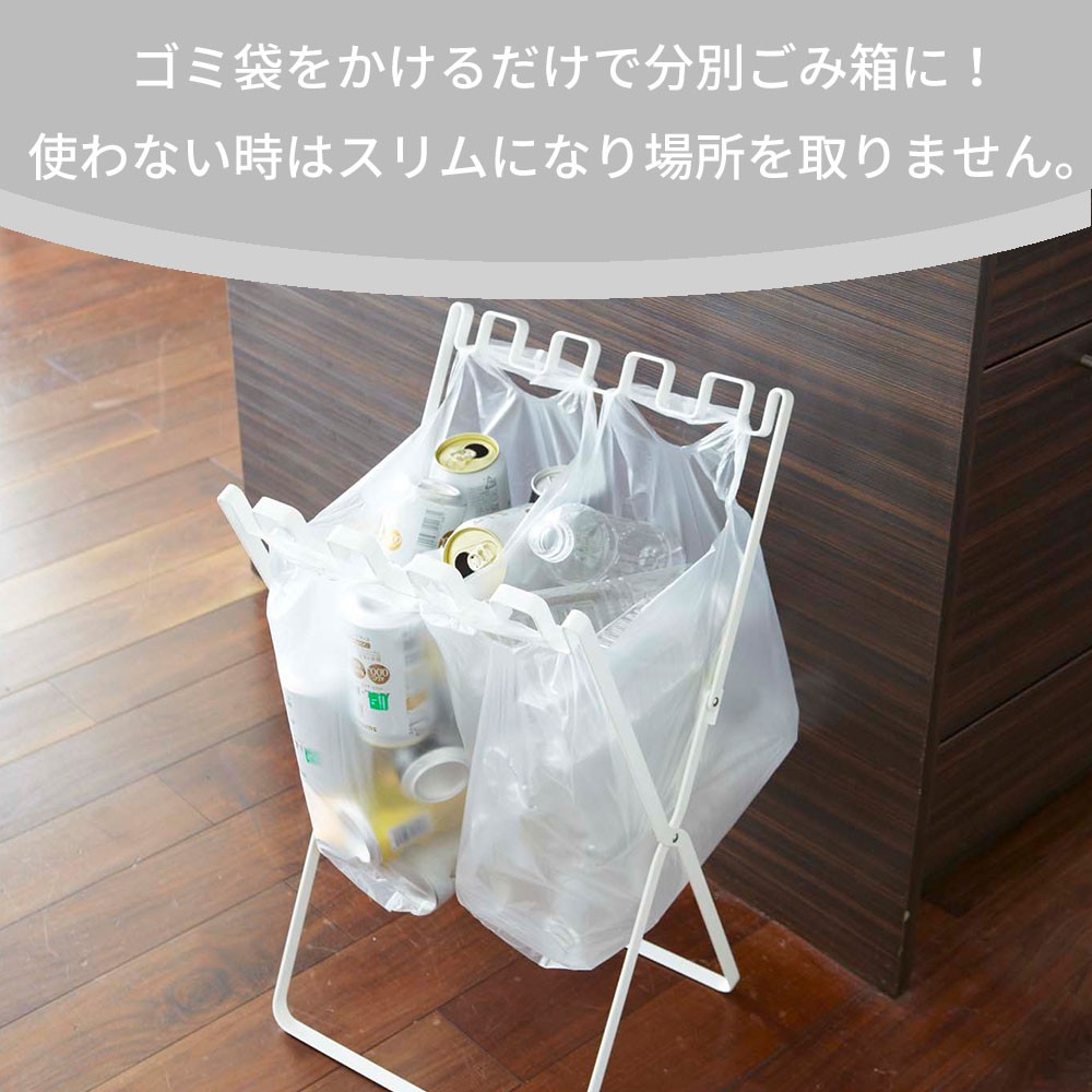 レジ袋やごみ袋を引っ掛けるだけで簡単に分別ゴミ箱に! このスタンド1台で最大4分別できちゃう。お好みに仕切れるのでとっても便利! 付属のマグネットで45Lの大きい容量のゴミ袋(持ち手なし)も取り付けることができます。しかもこのスタンド、口をパタンと閉めることができるので気になるニオイやムシにも対策ができるのが嬉しい! 使わない時は非常にスリムになるので、収納に入れるときもかさばらずスッキリ。屋外に持ち出すときも薄いので車に乗せてキャンプやイベントで使用もオススメです! |