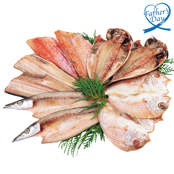 真あじ開き(長崎県産)60g×2枚、連子鯛開き(長崎県産)90g×2枚、かます開き(国産)80g×2枚、縞ほっけ半身干し(米国産)70g×2枚、金目鯛半身干し(クック諸島産)70g×2枚