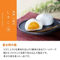 ◆富士柿大福:愛媛県八幡浜の特産品"日本一大きい柿"『富士柿』を程よい大きさにカットし、富士柿の甘さを引き立たせるため、特製のクリームチーズ餡で包んだ逸品。
