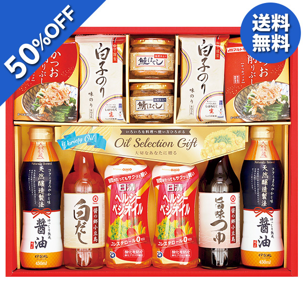 マルキン(旨味つゆ・白だし)各360ml、日清ヘルシーベジオイル350g×2、伊賀越天然醸造醤油450ml×2、白子味のり(8切5枚)×4、マルトモかつお削りぶし1.5g×4P×2、鮭ほぐし40g、鯖ほぐし40g