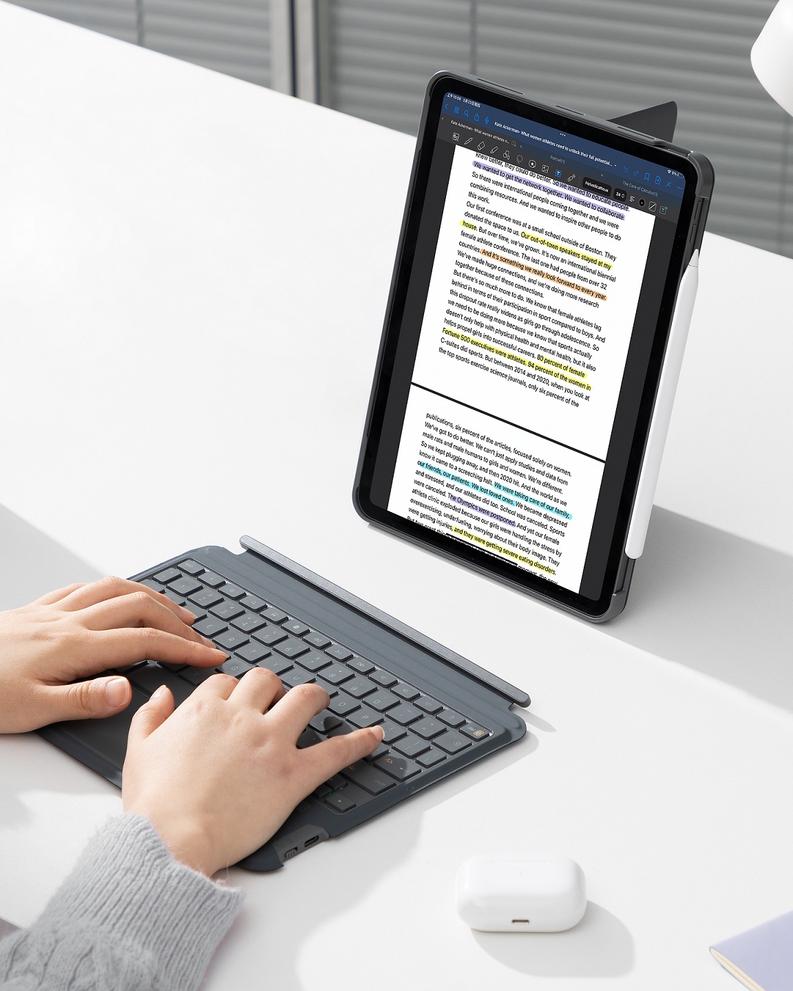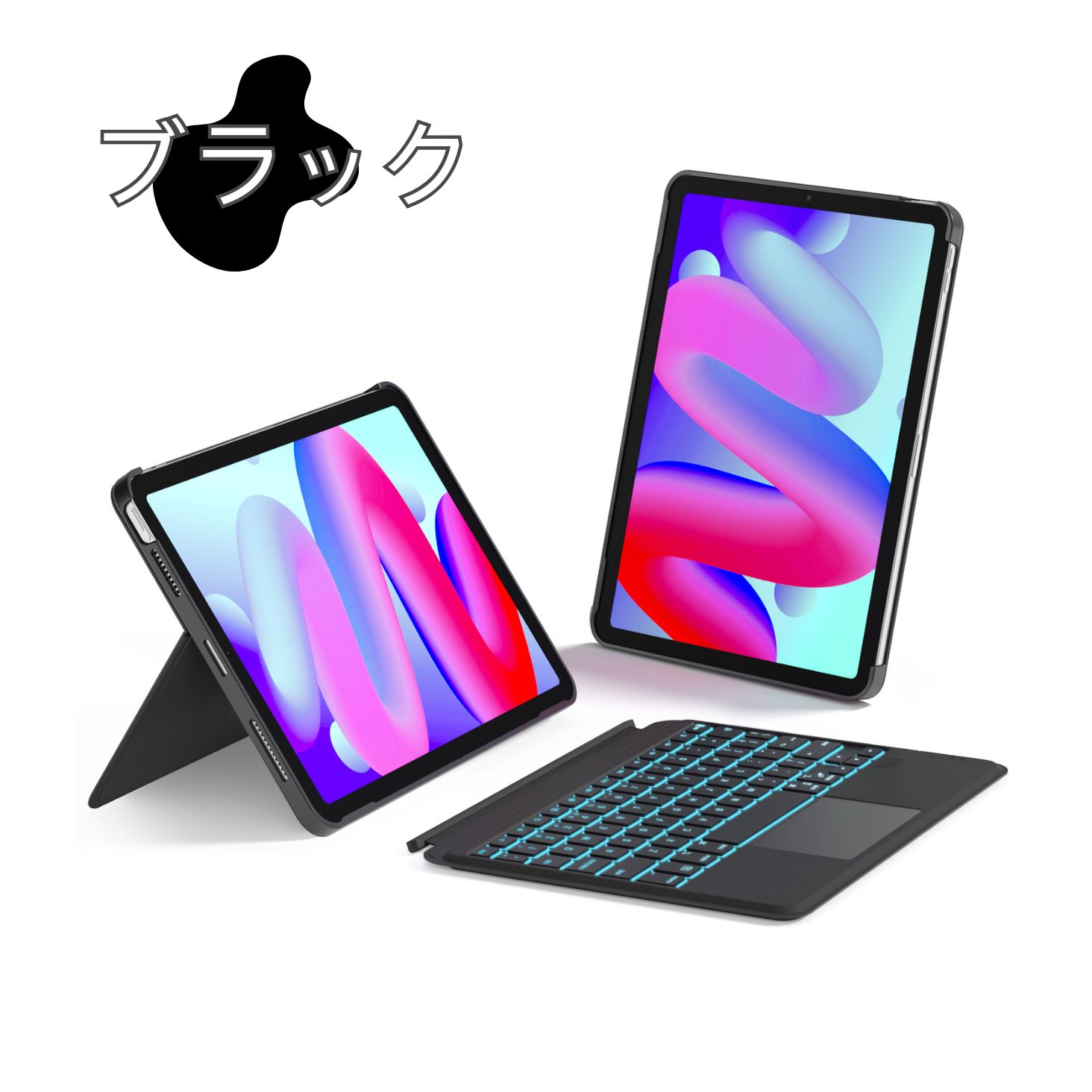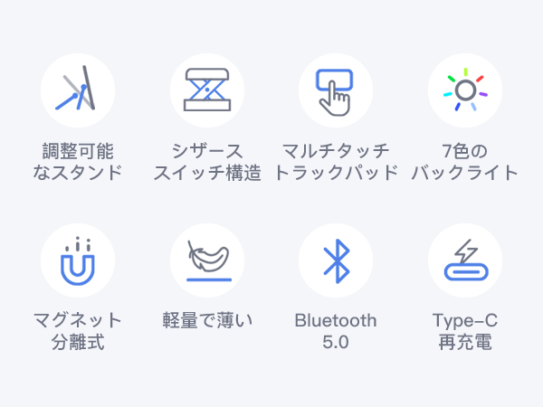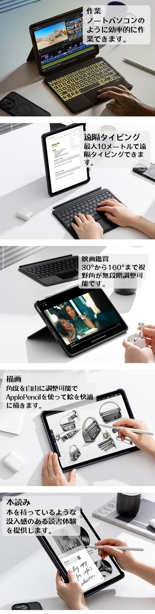 分離式キーボードは簡単に取り外すことができ、カバーもキーボードも単独使用できます。角度無段階調整できるスタンド付き、仕事、タイピング、映画、絵画、読書に自分の姿勢や目線に合わせて、一番読みやすい角度に調節することができます。