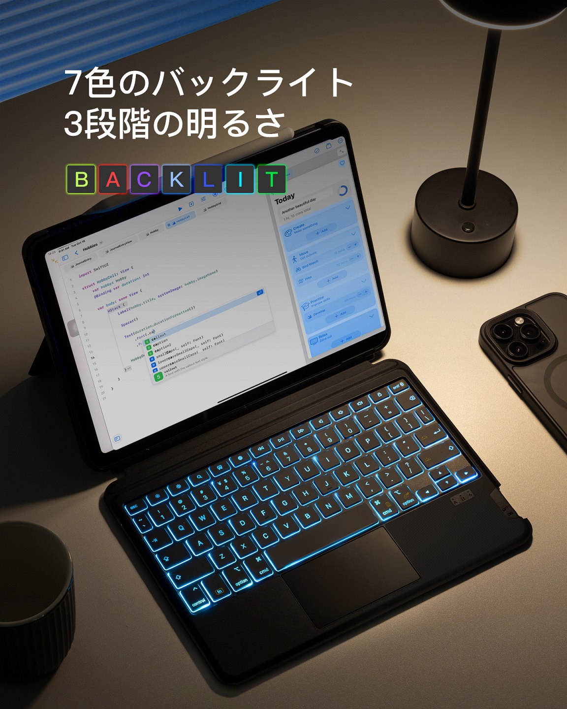 調節可能の7色のバックライトと3段階の明るさは、飛行機内や寝室などの暗い場所でも快適なタイピングが行えます。