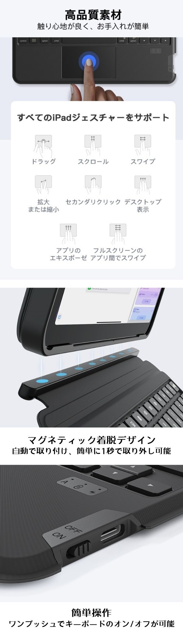 タイピング:分離式キーボードでより便利に使用できます。キーボードを取り外して、iPadと適切な距離を取って操作したり、ケースに取り付けて持ち運びが簡単にできます。最大10メートルで遠隔タイピングできます。