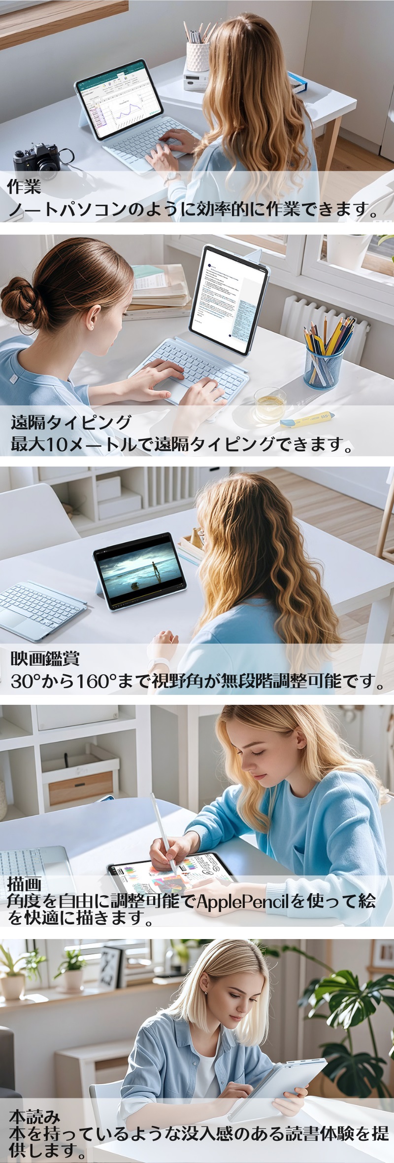 分離式キーボードは簡単に取り外すことができ、カバーもキーボードも単独使用できます。角度無段階調整できるスタンド付き、仕事、タイピング、映画、絵画、読書に自分の姿勢や目線に合わせて、一番読みやすい角度に調節することができます。