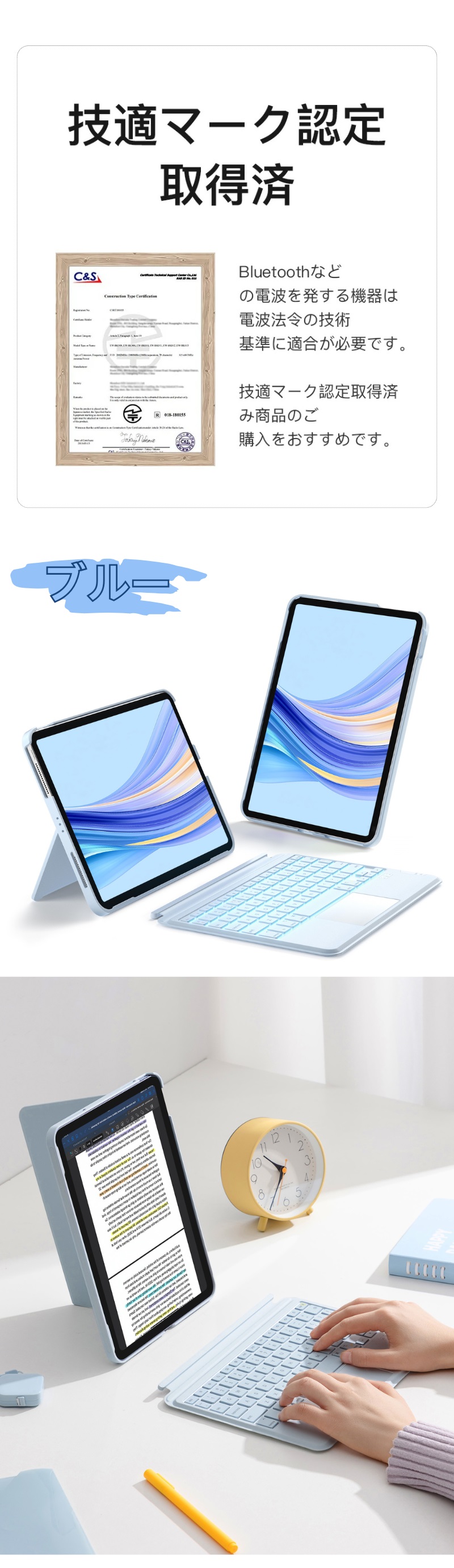 タイピング:分離式キーボードでより便利に使用できます。キーボードを取り外して、iPadと適切な距離を取って操作したり、ケースに取り付けて持ち運びが簡単にできます。最大10メートルで遠隔タイピングできます。