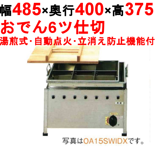 商品名:おでん鍋 湯煎式/自動点火 立消え防止機能付 OA15SWIDX 寸法:幅485mm×奥行400mm×高さ375mm 送料区分:送料無料 お届け数:1 商品コード:cr1-oa15swidx プロパンガス消費量(kw):2.58 都市ガス消費量(kcal):2221 プロパンガス接続口:9.5mm 都市ガス接続口:9.5mm 仕切り:6ツ仕切