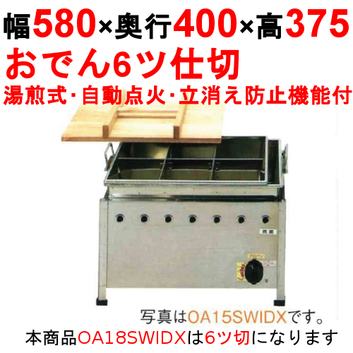 商品名:おでん鍋 湯煎式/自動点火 立消え防止機能付 OA18SWIDX 寸法:幅580mm×奥行400mm×高さ375mm 送料区分:送料無料 お届け数:1 商品コード:cr1-oa18swidx プロパンガス消費量(kw):2.89 都市ガス消費量(kcal):2485 プロパンガス接続口:9.5mm 都市ガス接続口:9.5mm 仕切り:6ツ仕切