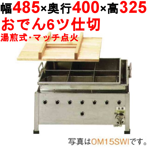 商品名:おでん鍋 湯煎式/マッチ点火 OM15SWI 寸法:幅485mm×奥行400mm×高さ325mm 送料区分:送料無料 お届け数:1 商品コード:cr1-om15swi プロパンガス消費量(kw):2.58 都市ガス消費量(kcal):2221 プロパンガス接続口:9.5mm 都市ガス接続口:9.5mm 仕切り:6ツ仕切