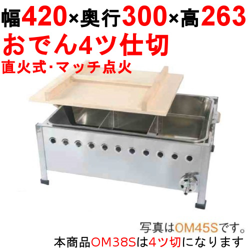 商品名:おでん鍋 直火式/マッチ点火 OM38S 寸法:幅420mm×奥行300mm×高さ263mm 送料区分:送料無料 お届け数:1 商品コード:cr1-om38s プロパンガス消費量(kw):2.01 都市ガス消費量(kcal):1728 プロパンガス接続口:9.5mm 都市ガス接続口:9.5mm 仕切り:4ツ仕切