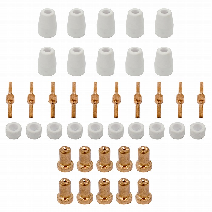 | 【セット内容】 ●ノズルカラー×10 ●電極×10 ●チップ×10 ●シールドカップ×10 ※お使いのトーチ消耗品の寸法と同等でございましたら使用可能でございます。 |
