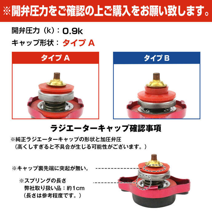 | ボンネットを開ければ一目で水温がわかり、異常に気づける超便利な水温計付きのラジエターキャップ! ラジエーターキャップは単なる蓋ではなく、冷却装置内の圧力を適正に保つ重要な部品です。 ラジエーターキャップ内側にあるシールが劣化・変形・破損等すると弁の動作が悪くなり、オーバーヒートの原因となります。 走行条件によって異なりますが、車検の時または5〜7年ごとの交換がおススメです。 ラジエーターキャップは「ひねって回すだけ!」で開けることができますが、火傷の危険もあります。 水温を確認しながらエンジン調整ができる為、安全にキャップを外すことができ、事故防止や作業の効率化を図ることが出来ます。 また、ホワイトメーターの文字盤が見やすく、温度の確認がスムーズに行えます。 圧力別に0.9k、1.1k、1.3kと3種類取り扱っておりますので、お車の状態や年式によりお選び下さい。 詳細は各商品ページにてご確認ください。 ※車両により適用が異なる場合がございます。 年式・車両型式・エンジン型式及び純正ラジエターキャップの形状と開弁圧力を必ずご確認ください。 ※メーターの数値は目安となります。 ※車や走行距離の長い車は圧力高めのキャップにしますとエンジンに不具合が生じてしまう場合がございます。 |