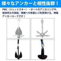 小型船舶の海、レジャーの必需品! PWC(ジェットスキー)やボートなどをアンカリングするのに便利! 様々なアンカーと相性抜群です! 《伸縮》 ゴムの伸縮が風や波からの衝撃を和らげるので、係留ポイントが移動しません。 長すぎるロープが吸い込まれる危険も低減します。 《両端フック》 ロープの両端はフック! 艇体同士の係船や桟橋への係留が素早く簡単に行えます。 《視認性》 太く目立ちやすいので、係船時の見逃しによる巻き込みを防止します。 |