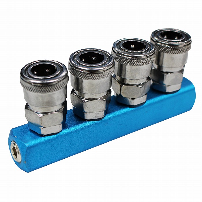 エアーツールの増設に! エアコンプレッサー用の分岐ソケットです。 一つの配管口より複数のエアの取り出しが可能です。 プラグ接続方法はソケットをスライドさせ、プラグを差込み、戻すだけのステップ! |