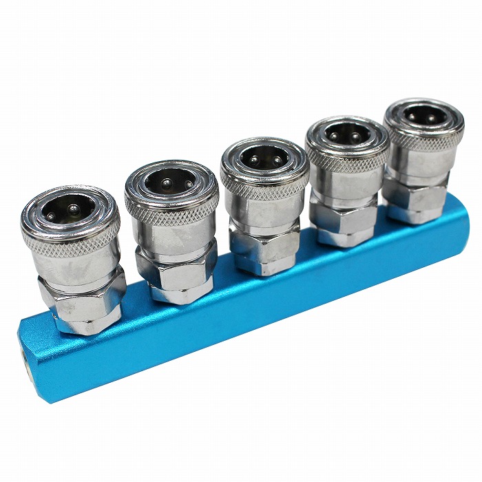 エアーツールの増設に! エアコンプレッサー用の分岐ソケットです。 一つの配管口より複数のエアの取り出しが可能です。 プラグ接続方法はソケットをスライドさせ、プラグを差込み、戻すだけのステップ! |