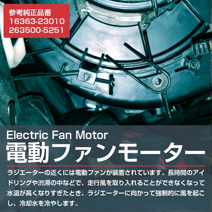 | 純正品番対応の電動ファンモーターです。 モーターのみになりますのでご注意ください。 ※車種によってはハーネスが必要になる場合があります。 ※ファンに向かって【右側】となります。 |