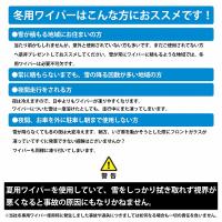 | ウィンターシーズンにお勧め! 風・氷雪に強い!! 高速走行時の拭きが違う! 低温下でも柔軟なゴムカバーが雪や雨の侵入を防ぎ、ブレードの凍結を防止します。 シリコンブレードですので耐久性が非常に優れております。 摩擦抵抗を軽減するため、グラファイトとモリブデンでゴムをコーティング。 高い摺動性、静粛性を実現し、安全な視界を保ちます。 ブレード一体式ですので、替えゴムには対応しておりません。 U字フック幅9mmまでの車種に対応しております。 取付はワンタッチ方式でとても簡単にできます。 もちろん雪以外に雨の日にもご使用可能! 雪の日だけ付け替える手間は不要です。 冬の間はずっとご使用可能です! 冬でも夏用ワイパーのままでは雪をしっかり拭き取れず、事故の原因となることもございます。 いつでもクリアな視界を確保するために冬季には冬用ワイパーのご使用をお勧めします。 ※当社冬専用ワイパー使用時に発生しました事故や過失につきましては、如何なる場合も一切の責任を負いません。 |