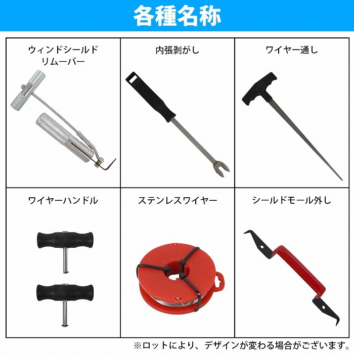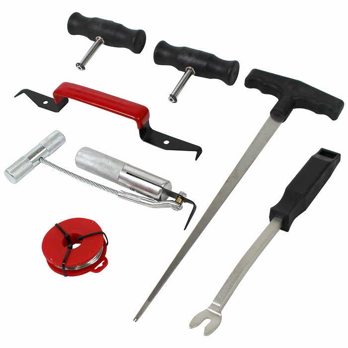 | フロントやリアのガラス交換に必要な工具セットです。 ウインドシールドリムーバー等 7点揃っています。 シーリング材の切り離し作業など便利にお使いいただけます。 |