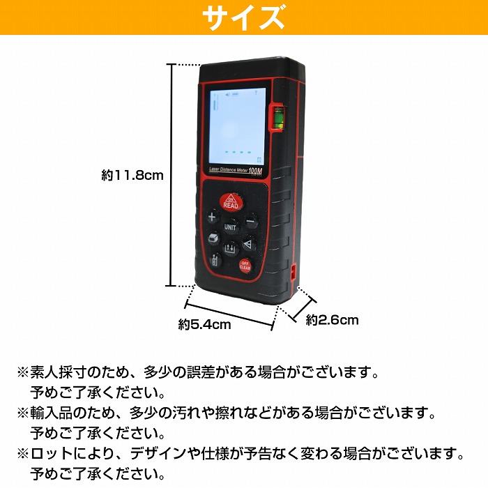 | ・サイズ(約) ・本体サイズ:11.8×5.4×2.6cm ※収納ケース付き ・測距範囲(屋内):0.03m-100m ・測距精度:プラスマイナス3.0mm ・電源:単4乾電池×2本 ・自動電源オフ:約8分 ・自動レーザーオフ:約60秒 ※レーザービームは直視しないでください。 ※日光条件とターゲットの拡散反射は弱い場合に、反射板をご利用ください。 ※当商品は海外製品のため、多少の傷、汚れ、サビなどがある場合がございます。 予めご了承の上、お買い求め下さい。 |