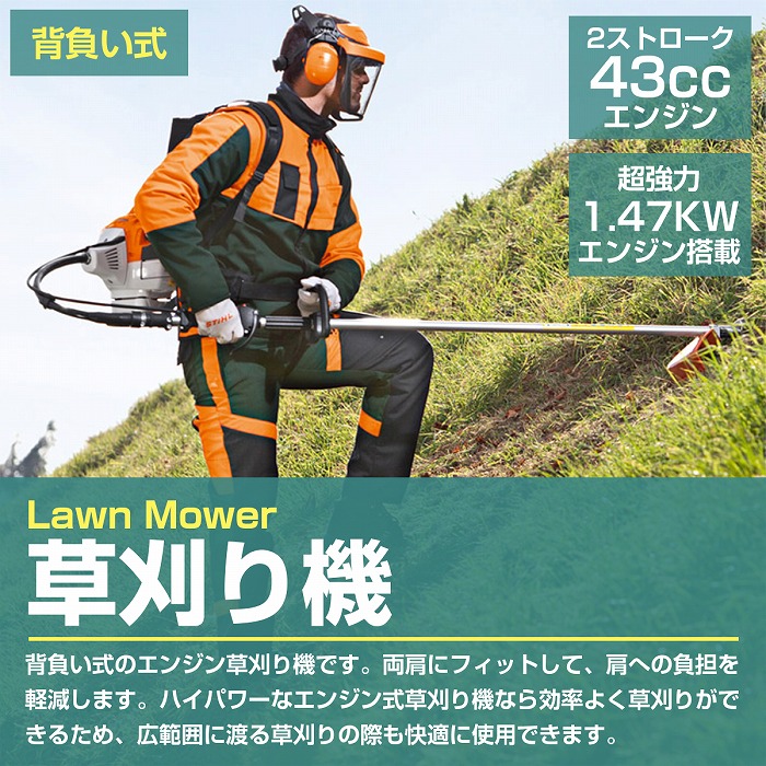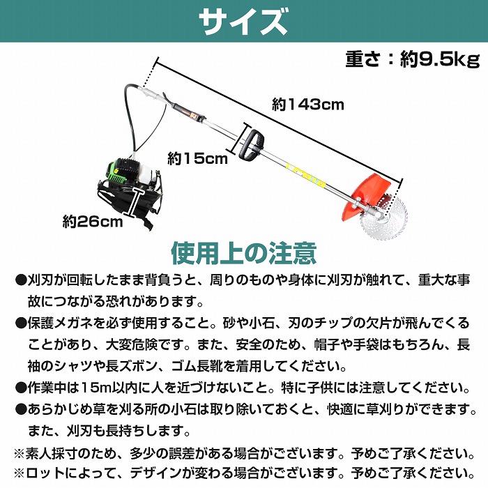 | 雑草・芝生の刈込に便利な2ストロークエンジン草刈り機です。 コンクリートや石の多い場所に最適なナイロンカッターと 頑固な雑草を刈り込むのに最適な金属刃が付いており、 状況に応じて使い分けることができます。 【片手で簡単操作】 セーフティロック付きで安心!手が離れれば止まる安全設計です。 使いやすいハンドルグリップで作業効率もアップします。 【背負い式】 厚みのあるクッションで振動を減少させ、腰や体への負担を軽減します。 ループハンドルは縦に動かしやすく、傾斜地でも操作がしやすいです。 【ナイロンカッター付き】 付属のナイロンコードを使えば、コンクリートやフェンスのキワなど 多少の凹凸があっても危険が少なく安心です。 先端を地面で軽く叩くだけでナイロンコードを引き出すことが可能です。 ※注意事項※ 必ずゴーグル(保護メガネ)を着用の上、使用してください。 作業中はキックバックなどによる転倒やケガに十分な注意が必要です。 |
