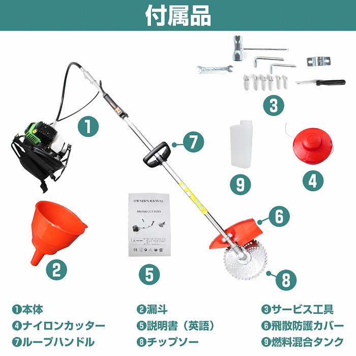 | 【仕様】 エンジン:2ストローク 1.47kw 排気量:43cc キャブレター:ダイヤフラム式 始動方式:リコイルスターター 使用燃料:混合油 (25:1) 無負荷回転数:2800〜3200r/min 騒音:114dB タンク容量:1.2L 重量:9.5kg サイズ:画像参照 チップソー寸法(約):外径255mm×取付穴径25.4mm チップソー刃数:40P 本体カラー:グリーン 【商品内容】 ・本体 ・チップソー ・漏斗 ・取付工具 ・ナイロンカッター ・飛散防護カバー ・燃料混合タンク ・ループハンドル ・英文説明書 ※日本語の取扱説明書は付属しておりません。 |