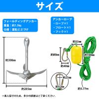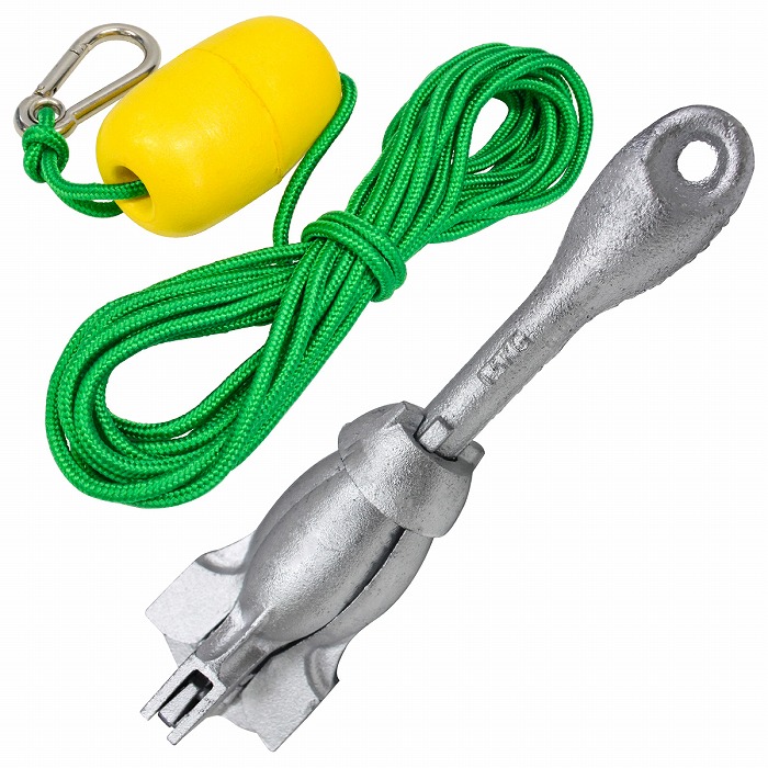 釣り・小型ボート等に最適! フォールディングアンカーとアンカーロープのお得なセットです♪ 様々な底質で使用でき、特に岩礁の底質で効果を発揮するフォールディングアンカーです。 海底で引っかかってしまった場合に備え、アンカーの下部にも紐を通せる穴が開いています。 鋳物のメッキ製(溶融亜鉛メッキ)です。 ボート等の船舶備品・係船用品としてお使い下さい。 コンパクトに折り畳めるので、置き場所に困りません。 アンカーロープは軽量&コンパクト! 船での置き場所にも困りません。 シーアンカーの回収用ロープとしてもご利用いただけます。 フロートがアンカーの位置を示してくれるので、回収が簡単になります。 |
