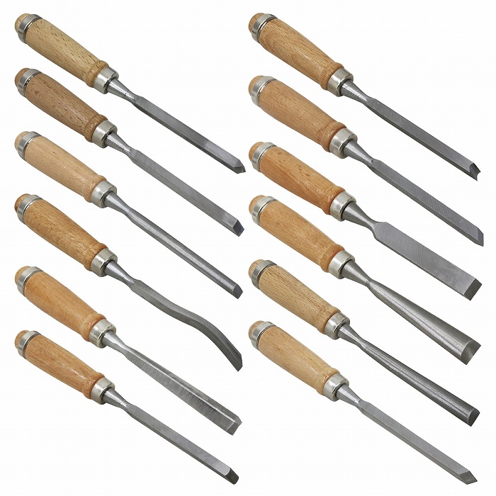 | 【セット内容】 切り出し刀(左右) 平刀×2 三角刀×2 丸刀×5 曲平刀 計12本セット 収納ケース付 【サイズ】 全長:20cm 持ち手:約9.4cm ノミ幅:画像参照 ※切れ味が悪かったり、お好みの切れ味にしたい場合は研いでからご使用ください。 ※刃を触った後や水分が付いた時は必ず乾いた布で拭き、湿気の少ないところで保管してください。 |