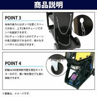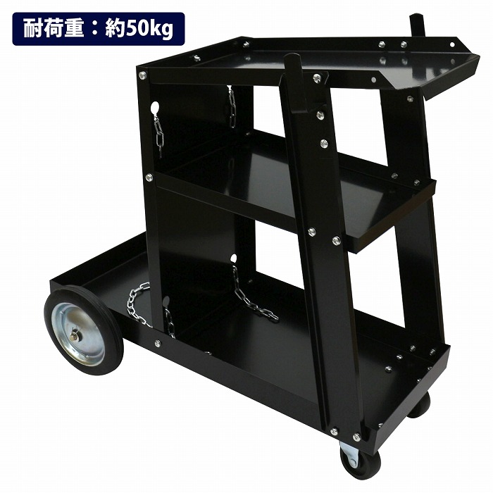 | 溶接機、ボンベ、工具等をまとめて収納&移動が出来るウェルダーカートです。 【収納力抜群の3段トレー】 溶接機などの大きな物は上段トレーに、工具などの小さな物は中・小段トレーに収納できます。 上段の左右二箇所に、コードやケーブルをひっかけておけるステーを装備してあるので便利です。 【ボンベ置き】 本体の後ろにはボンベを置くスペースがあり、上下2本のチェーンでボンベを固定できます。 穴にチェーンをひっかけてチェーンの長さ調節ができるので、様々なボンベサイズに対応できます。 【スムーズな移動】 前輪は360度回転可能な自在キャスターなので、重い物を載せても楽に移動できます。 |