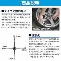 | クロスレンチは力を掛けずに作業効率を上げることができ、 両手で作業ができるので、タイヤ交換がスムーズに行えます。 また、早回しレンチとしても使用可能! スムーズな回転で、ナットの着脱が迅速に行えます。 クロスレンチのソケットは4サイズです。 【 17 / 19 / 21 / 23mm】であらゆるニーズに対応できます。 |