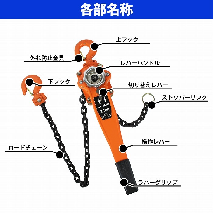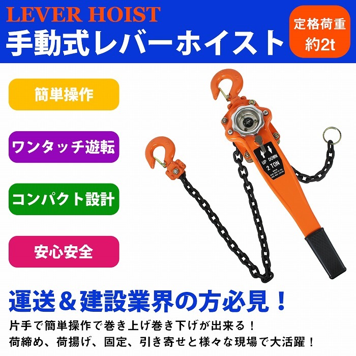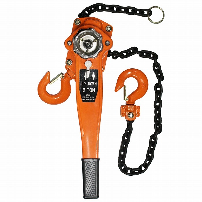 | 手動回転式 レバーホイスト 操作レバーを回転させることで、巻き上げ&巻き下げを行います。 ●ワンタッチ切り替え 巻き上げ、巻き下げの「切り替え」は片手で簡単に行うことができます。 切り替えレバーを「UP」もしくは「DOWN」に合わせ、 レバーハンドルを回転させることでチェーンの長さの調節が可能です。 ●遊転機能 チェーンが無負荷状態で切り替えレバーをニュートラルに合わせると、 簡単にチェーンの送り戻しが出来ます。 ●ブレーキ構造 ブレーキは安全性の高いダブル爪を採用! 万が一、片方が破損してももう片方が作動し、落下等を防ぎます。 ●安心安全フック 上下のフックは外れ防止金具付き!チェーンがたるんでも外れる心配はありません。 ●多様な作業用途 運送、建築、土木、農林業、マリーナなどあらゆる用途で使用可能! 重量物の吊り上げ、斜め引き、積荷の締め付け、横引き作業 等 |