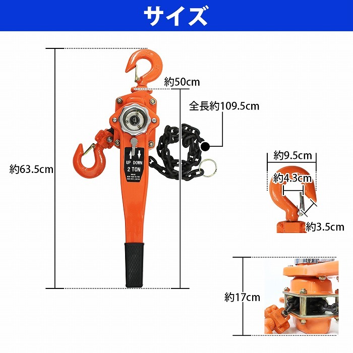 | 【商品詳細】 定格荷重:2T 巻き取りチェーン長さ:約 1.1m フック開口寸法:約 35mm ハンドル長さ:約 500mm 重量:約 11kg サイズ等、詳しくは画像をご確認ください。 ※適用範囲で安全に配慮してご使用ください。 ※サイズ・仕様・カラーはロットにより若干異なる場合がございます。 ※当商品は海外製品のため、多少の傷、汚れなどがある場合がございます。予めご了承の上、お買い求め下さい。 他はこちら↓ 0.75t 1t 1.5t 2t 3t |
