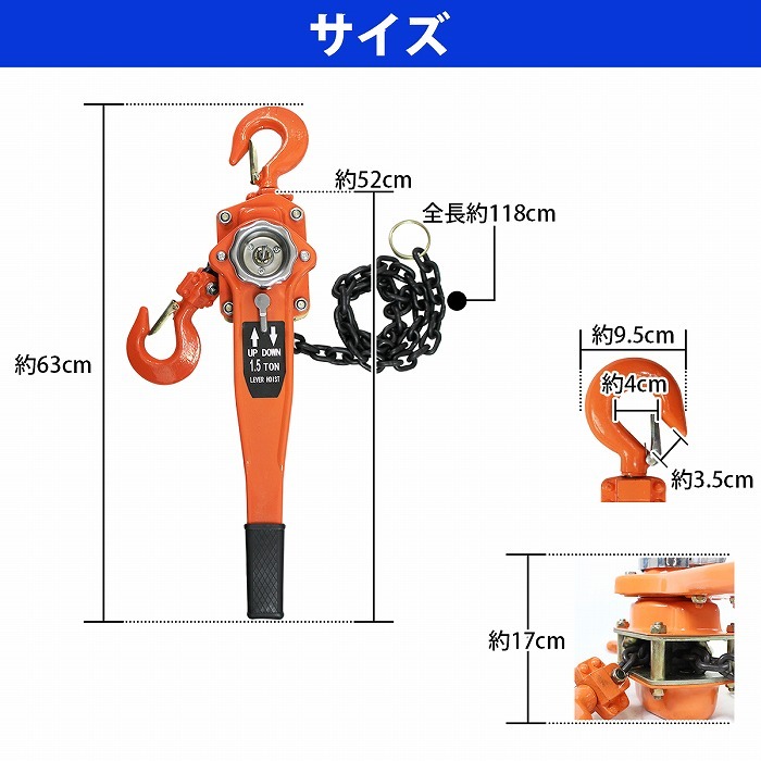 | 【商品詳細】 定格荷重: 1.5T 巻き取りチェーン長さ:約 1.2m フック開口寸法:約 35mm ハンドル長さ:約 520mm 重量:約 11.5kg サイズ等、詳しくは画像をご確認ください。 ※適用範囲で安全に配慮してご使用ください。 ※サイズ・仕様・カラーはロットにより若干異なる場合がございます。 ※当商品は海外製品のため、多少の傷、汚れなどがある場合がございます。予めご了承の上、お買い求め下さい。 他はこちら↓ 0.75t 1t 1.5t 2t 3t |