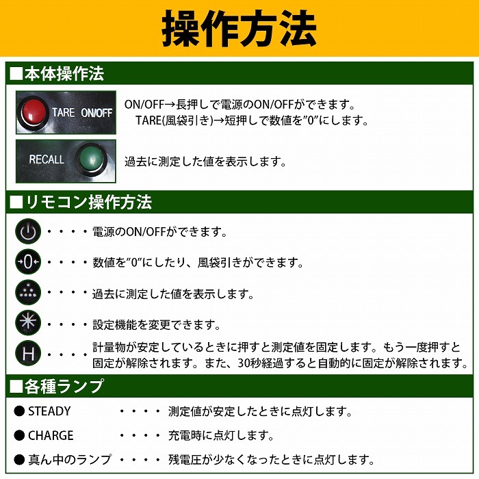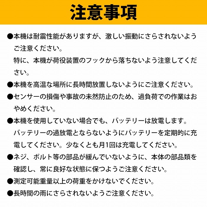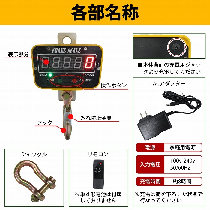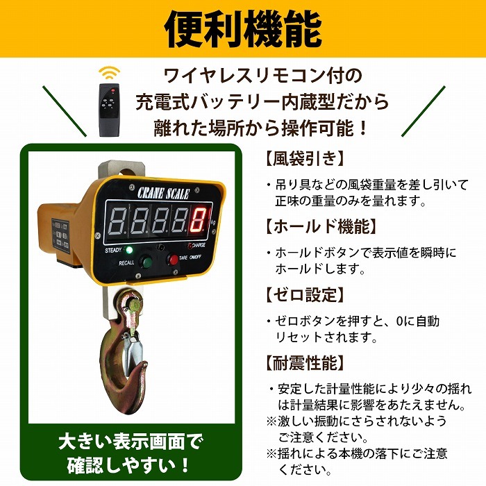 | 移動+計量が一度にできるクレーンスケールです! 持ち運びも可能なので、現場での計量もできます。 【遠隔操作】 リモコンを使えば20m離れた場所からの操作も可能! (環境によって距離は異なります) 【充電式】 コンセントが近くにない場所でも最長60時間使用可能! 充電式バッテリー内蔵型だから離れた場所からも操作可能! ケーブルを繋いで家庭用コンセントに挿すだけで充電ができます。 電池交換も必要ありません。 【デジタル表示】 デジタル表示で見やすい大画面♪ 暗い場所でも認識できます。 【耐震・防水】 少々の揺れがあっても計量結果に影響を与えません。 雨の中での測定も可能です。 【便利機能】 風袋引きやゼロ設定などはかりとしての基本機能はもちろん完備! ホールド機能を使えば測定値を固定します。 当商品は海外製品のため、多少の傷、汚れなどがある場合がございます。 ご使用に問題はございませんので、ご了承の上、お買い求め下さい。 |