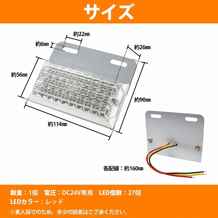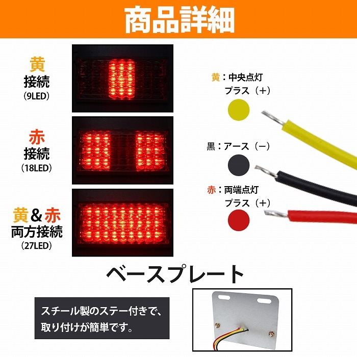 | ▼商品内容 仕様:DC24V LED:27LED 発光色:レッド 数量:1個 ▼配線説明 黄色:ブレーキ配線 赤線:スモール配線 黒線:アース(−) 黄/9灯点灯 赤/18灯点灯 黒/アース ▼他カラー&まとめ買いはこちら▼ 【ブルー/青】 《 1個 》 《 4個 》 《 10個 》 【グリーン/緑】 《 1個 》 《 4個 》 《 10個 》 【レッド/赤】 《 1個 》 《 4個 》 《 10個 》 【ホワイト/白】 《 1個 》 《 4個 》 《 10個 》 【イエロー/黄】 《 1個 》 《 4個 》 《 10個 》 |
